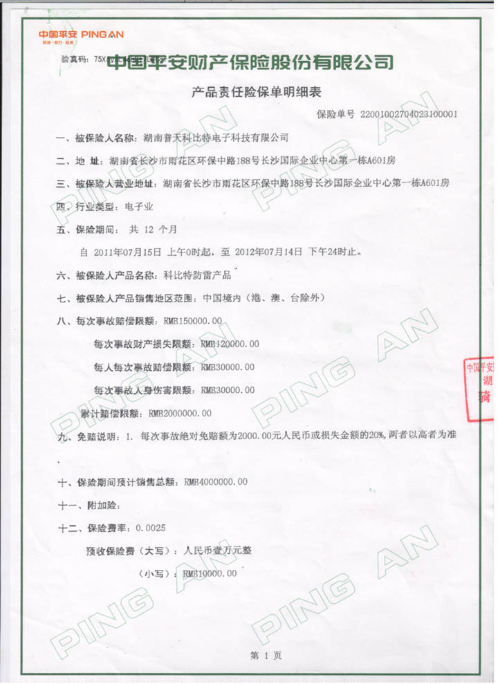 中國平安保險(xiǎn)質(zhì)量全程承保防雷產(chǎn)品